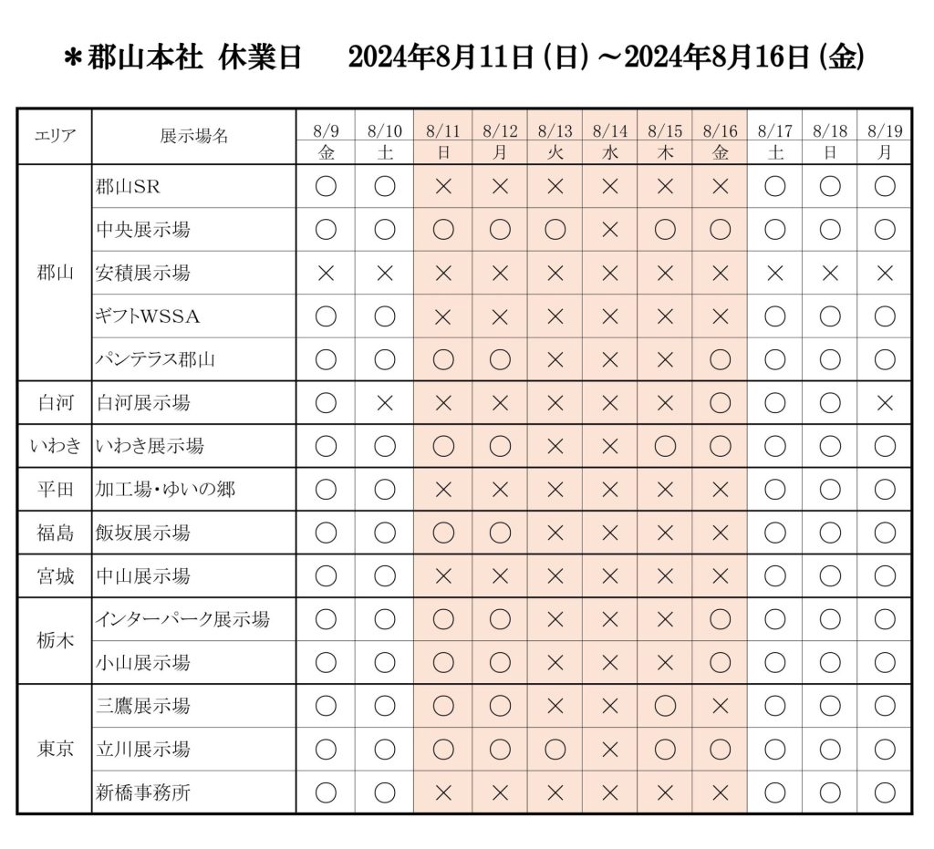 誠に勝手ながら、弊社では8月11日(日)から8月16日(金)までを夏季休業とさせて頂きます。 各店舗・展示場の休業日は上記の通りとさせていただきます。