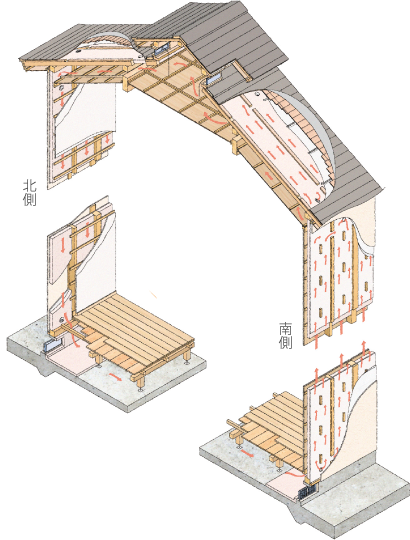 - 壁体内を太陽熱と生活熱による暖かい空気が循環