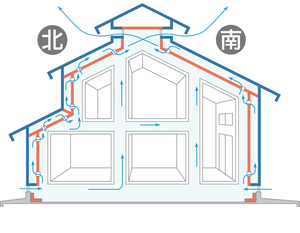太陽熱によって暖められた通気層の空気は、上昇気流によって、小屋換気口から外へ排出される。また上昇気流は、床下換気口から夜のうちに取り入れた冷風も引き上げて行きわたらせる。熱気を排出し、ため込まないため、室内は自然な涼しさに保たれる。