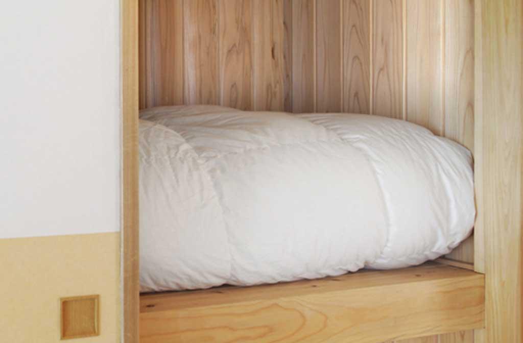 冬、一般の押入は冷たく湿りがちですが、エアパスの家は壁体内を暖かい空気が流れています。そのため湿気も少なくなり、押入内部が冷たくならず、布団も冷たくなりません。