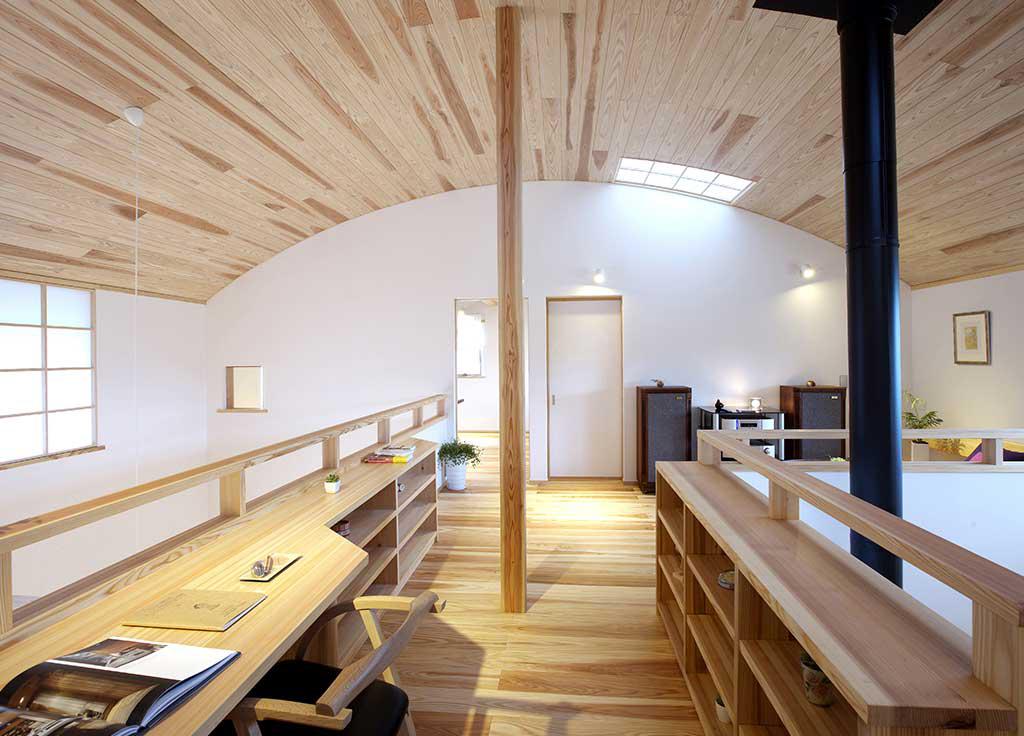 休みの日はリビングのソファに座り、吹き抜けを眺めていることが多い。空気の流れが見えるような気がする。会津の冬は寒く、前の家では石油、電気ストーブと各部屋に一つずつ置いて、その費用もかなりの額でしたよ。今は薪ストーブで家中が暖まります。薪ストーブの暖かさは体にとても優しく、薪を作るのは休日の運動に丁度いい。良いことづくめです。
