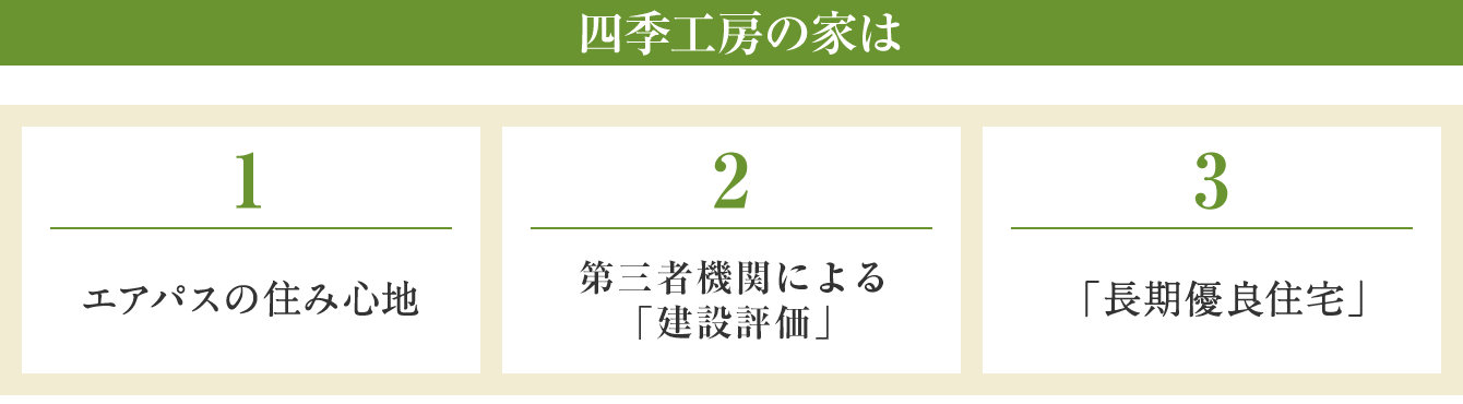 木造軸組工法をベースに無垢の木と自然素材でつくるエアパスの家。自然エネルギーを活用するパッシブソーラーの家は、耐震性、耐久性、維持管理のしやすさ、省エネ性とも高い性能を誇ります。エアパスの家は、耐久性、維持管理のしやすさについて、長期優良住宅の「劣化対策等級3」「維持管理等級3」(ともに最高等級)の型式認定を受けています。