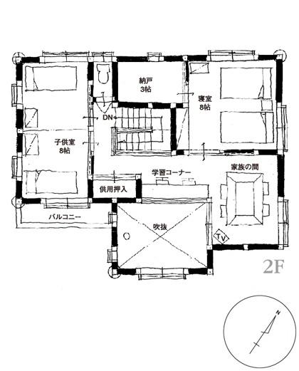 アルコーブ(凹部分)になったリビングは、ゆったりとしたくつろぎの時間を演出します。アイランド型の広々としたキッチンは、家族のコミュニケーションを深め、ホームパーティなどにも重宝します。2階の吹抜けに面した家族の間は、セカンドリビングとして多目的に活用できます。