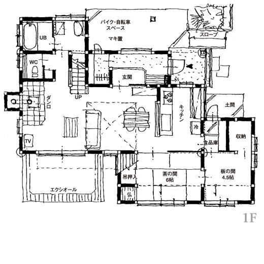 「茶の間で食事を」という生活スタイルに合わせて、キッチンを茶の間に近接させて、動線を軽快にしました。リビングはゆとりあるくつろぎ空間になるよう、薪ストーブとゆったりしたソファーが置けるスペースを設けました。また、リビングの南側にはエクシオールをつけて、屋外の自然と交流を図れるよう工夫しました。