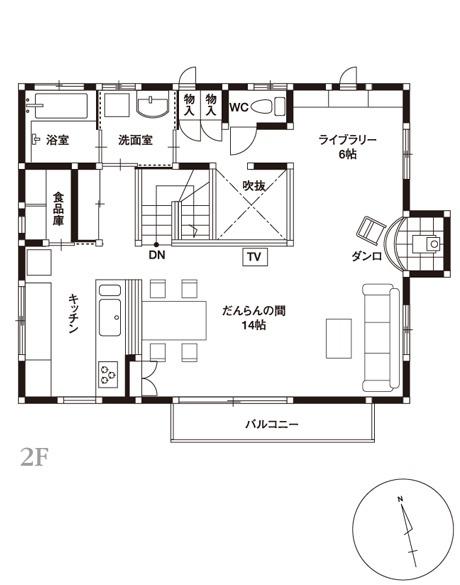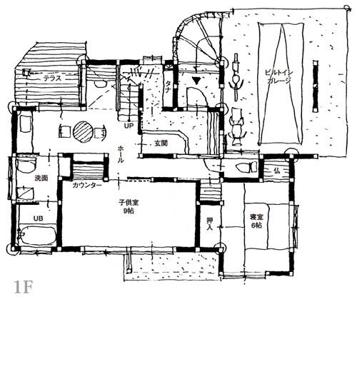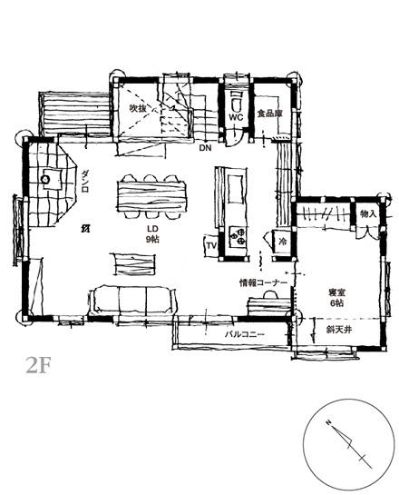 生活の中心を2階にして、部屋も細かく仕切らず、あえてタタミの間を設けずにワンルーム感覚の広々とした空間をつくりました。リビングの中心に暖炉を置き、その奥にライブラリーコーナーを併設しました。1階は2人の子供と夫婦のための寝室とたっぷりの納戸を設けました。
